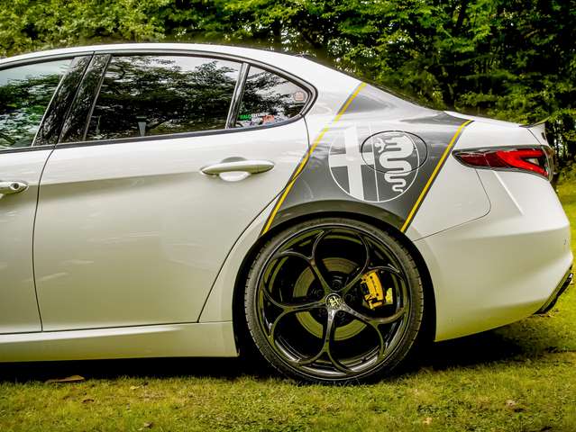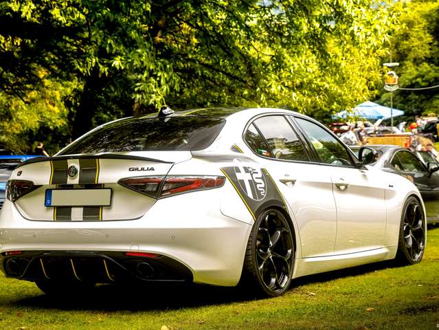 Der Heckansatz ist von der Giulia Veloce in Glanzschwarz mit schwarzen Endrohrblenden.
