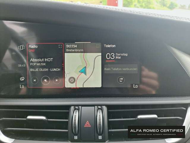 Getriebe Automatik (8 Stufen), Leder, Digitaler Tacho, LED Matrix Licht, Scheckheftgepflegt, Subwoofer, Unfallfrei, Verkehrszeichenerkennung, Euro6e, Herstellergarantie, Alfa Romeo & Jeep SELECTED4U, schwarz, Landesversion Deutschland, 4-türig, grüne Umweltplakette (4), 1. Hand, 3. Bremsleuchte, Außentemperaturanzeige, Kopfstützen im Fonds, Rückleuchten LED, abgedunkelte Scheiben im Fond, Außenspiegel elektr. anklappbar, AUX-In Anschluss, Durchlademoeglichkeit, Fahrersitz höhenverstellbar, Innenraumfilter, Keyless-Go, Lenksäule einstellbar, Multimediasystem, Nichtraucherfahrzeug, Servoschliessung, Vordersitze höhenverstellbar, Uhr & Drehzahlmesser, Allrad, 4 Einstiegstüren, Abgedunkelte Scheiben (Privacy Verglasung), Metallic, Vorführfahrzeug, Benzin, Diese Giulia Veloce verfügt zusätzlich zur Serienausstattung über folgende Sonderausstattung: