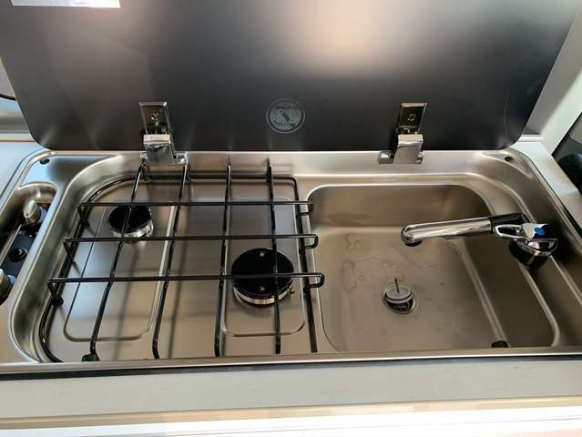 * 2-Flammen-Kocher mit integrierter Spüle und separater Glasabdeckung