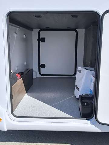 Mülleimer, Heckstoßstange mit LED Leuchten, Rückfahrsensoren, 230V- und 12 V-Steckdosen in der Garage,