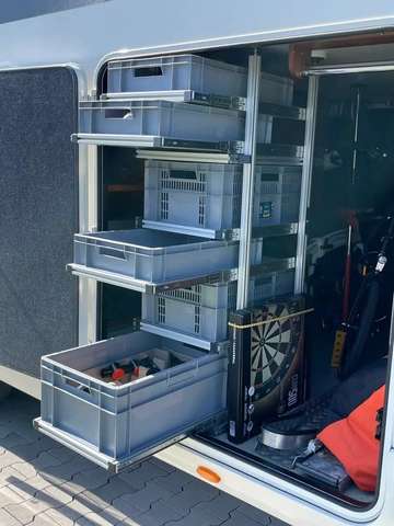 Außen Tür (Doppelboden, Fliegengittertür, Markise elektrisch 6 Meter, Rahmenfenster, elektrische Trittstufe, Gas Außensteckdose für Grill)