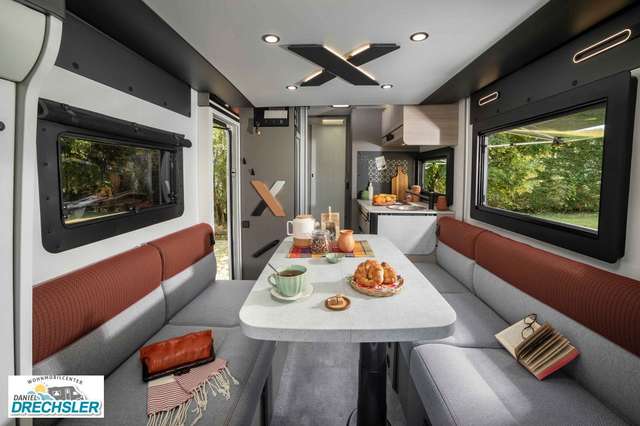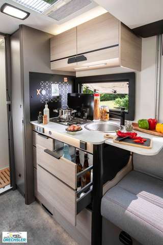 - X Zubehör: Markise, Solarmodul, Außenbeleuchtung Eingangstür, Fliegengitter, Innenjalousie Fahrerhaus, Schlafplatzergänzung Dinette, Einbaukit für die zweite Batterie (1)