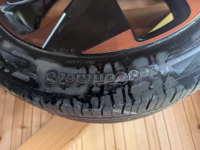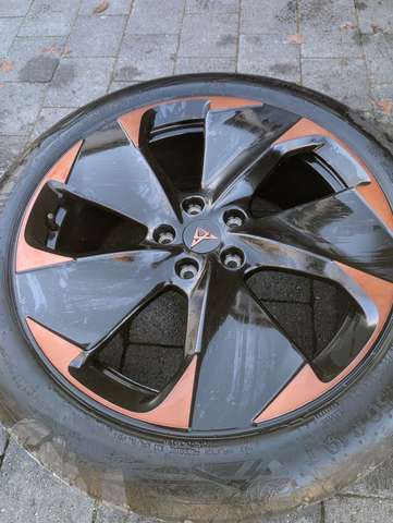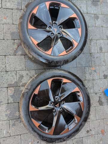 Er ist 8-fach bereift mit Alu-Felgen von Cupra. Die Sommerreifen sind auf 19 Zoll Original Alu Felgen (siehe Fotos), aktuell montiert sind 18 Zoll Orignal Alu Felgen mit Winterreifen. Bei beiden Reifen haben wir auf spezielle hochwertige Elektroauto Reifen geachtet. Sie sind in Top Zustand