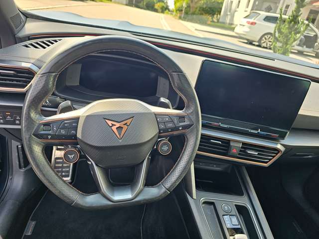 Sportausstattung CUPRA Formentor VZ; Virtuelles Cockpit; Mittelarmlehne vorne; Supersportlenkrad mit Tiptronic, beheizbar; Motorsportschalensitze vorn, Lendenwirbelstütze, elektr. einstellbar für linke Vordersitzlehne; Sitzeinstellung, links elektrisch mit Memory, rechts mechanisch höheneinstellbar; Sitzheizung für Vodersitze getrennt regelbar (SHZ); Rücksitzbank ungeteilt, Lehne geteilt umlegbar mit Mittelarmlehne; Sitzbezüge in Stoff; Scheiben seitlich in Wärmeschutzverglasung, ab B-Säule und hinten dunkel eingefärbt; Sicherheitsinnenspiegel automatisch abblendbar