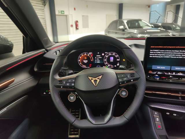 - Gewichtsbereich 4 nur Einbausteuerung keine Bedarfsprognose * Vorderachsgewicht Standard * Hinterachsgewicht Ausführung 2 * Federbereich 34 nur Einbausteuerung keine Bedarfsprognose * Reifendruckkontrolle * Start/Stopp-Anlage mit Rekuperation * Lendenwirbelstütze, manuell einstellbar in Vordersitzlehnen * Media System Plus mit 12,9 Display * Voll-LED-Scheinwerfer * Notbremsassistent Front Assist mit Fußgänger- und Radfahrererkennung * Heckscheiben-Wisch-Waschanlage mit Intervallschaltung * Scheibenwischer-Intervallschaltung mit Licht/Regensensor * Leuchtweitenregulierung,autom.statisch * 2 Leseleuchten vorn,2 hinten * 3D LED-Heckleuchten mit dynamischen Blinkleuchten und beleuchtetem CUPRA Logo * Nebelscheinwerfer und Abbiegeleuchte * Doppelton-Signalhorn * Tagesfahrlicht mit Assistenzfahrlicht u.Coming- u. Leaving-home Funktion automatisch * Gurtkontrolle, E-Kontakt vorn und hinten, optisch und akustisch * Volldigitales Kombiinstrument mit 10,25 TFT Display * Full Link * Connectivity Box inkl. Wireless Charger * CONNECT - vorbereitet für die Nutzung mobiler Online-Dienste * Ablenkungs- und Müdigkeitserkennung * Car2X * Kreuzungsassistent * Speedlimiter mit Intelligent Speed Assist (ISA) * Sitzmittelbahn in Stoff * Privater Notruf * Sportsitze vorn * Sprachsteuerung * Verkehrszeichenerkennung * Digitaler Radioempfang * 2 USB-C-Schnittstellen vorn und 2 USB-C- Ladebuchsen für die 2. Sitzreihe * Elektronische Parkbremse inkl. Auto-Hold-Funktion * Sportpedalerie in Aluminiumoptik * Elektronisches Stabilisierungsprogramm und elektromechanischer Bremskraftverstärker * Pannen-Set * Dynamiklenkung * Drive Profile * Kindersitzverankerung für Kindersitzsystem I-Size, 2 x top tether und Kindersitzverankerung vorn BF-Seite * Variables Ladebodenkonzept * Höheneinstellung,manuell,für Vordersitze * Kopfstützen hinten (3 Stück) * Dachreling, schwarz * Ausweichunterstützung mit Abbiegeassistent * Sicherheitsinnenspiegel automatisch abblendbar * Fensterheber mit Komfortschaltung und Abschaltsicherung, elektrisch * Airbag für Fahrer und Beifahrer, mit Beifahrerairbag-Deaktivierung * Sonnenblenden mit Spiegel, beleuchtet, mit Airbag-Label auf Sonnenblende und B-Säule * Seitenairbag vorn, mit Kopfairbag und Interaktionsairbag vorn * Mittelarmlehne vorn * Innenleuchte im Fußraum