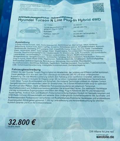 Erleben Sie den Hyundai Tucson Plug-In-Hybrid mit Allradantrieb, der Leistung und Effizienz perfekt kombiniert. Dieser gepflegte SUV aus dem Jahr 2021 überzeugt mit kraftvollen 265 PS und einer umfangreichen Ausstattung. Die rote Metallic-Lackierung verleiht dem Fahrzeug einen sportlichen Charakter, während das teillederne Interieur in Schwarz für Eleganz sorgt. Mit nur einem Vorbesitzer und lückenloser Servicehistorie bietet dieser Tucson Zuverlässigkeit und Sicherheit.