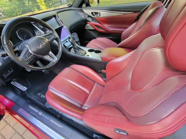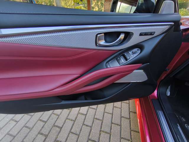 Die Lackierung des Q60 ist „Dynamic Sunstone Red (NBA)“ als Sondermetallic für die Sport Tech Variante. Die Innenausstattung in Silberoptikfaser mit Halbanilin-Ledersitzen in Monaco Red.