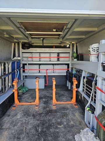 Er hat eine Standheizung und hinten Luftfederung. Der Iveco hat 5 Sitzplätze und Umgebaut hat eine Heckgarage da ist Platz für 2. Motorcross Maschinen oder andere Sachen. Darüber ist ein Bett mit einer Liegefläche 160cm x 200cm und Diverse Stauflächen ein Sonnrollo von Fiamma F65s ist auch Verbaut