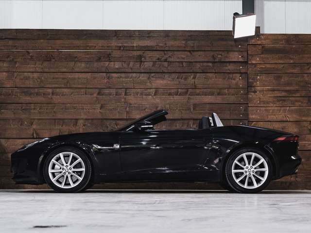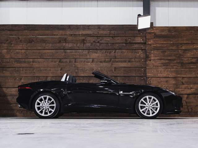 2014 Jaguar F-Type S P380 Cabriolet in Santorini/Ultimate Black und einer schwarzen Volllederausstattung sowie einem schwarzen Verdeck.