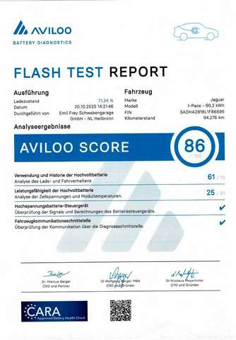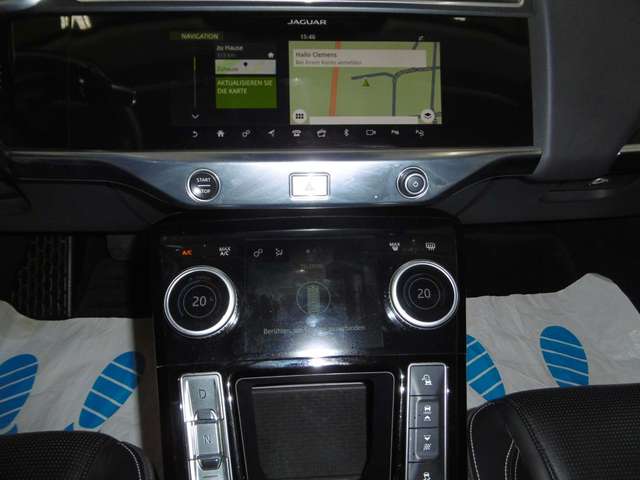 Adaptive Geschwindigkeitsregelanlage (ACC) mit Lenk-Assistent, Airbag Fahrer-/Beifahrerseite, Ambiente Interieurbeleuchtung, Antriebsart: Allradantrieb, Audio Interface (Universal-Schnittstelle für iPod / AUX / USB / MP3), Audiosystem Jaguar 140 Watt Sound-System, Ausstattungs-Paket: Totwinkel-Assistent, Außenspiegel elektr. verstell-, heiz- und anklappbar, mit Abblendautomatik, Memoryfunktion und Umfeldleuchte, Außenspiegel Wagenfarbe, Bluetooth-Schnittstelle, Bremsenergierückgewinnung, Dachhimmel Morzine in Light Oyster, Einschaltautomatik für Fahrlicht / Lichtsensor, Einstiegsblenden (Edelstahl) mit Schriftzug, Elektromotor 294 kW (cont. 172 kW, Dual-Elektromotor), Fahrassistenz-System: Adaptive Geschwindigkeitsregelanlage mit Verkehrszeichenerkennung, Fahrassistenz-System: Antriebsmomentkontrolle (Torque Vectoring), Fahrassistenz-System: Aufmerksamkeits-Assistent, Fahrassistenz-System: Autonomer Notbrems-Assistent (AEB), Fahrassistenz-System: Berganfahrhilfe (Hill-Holder), Fahrassistenz-System: Spurverlassenswarnung, Fahrassistenz-System: Verkehrszeichenerkennung, Fensterheber elektrisch vorn + hinten, Frontscheibe Verbundglas, Frontscheibe wärmedämmend, Frontstaufach / Frunk (Kofferraum, vorn), Geschwindigkeits-Regelanlage geländeabhängig (All Surface Progress Control, ASPC), Getriebe für Elektrofahrzeug, Getränkehalter hinten, Getränkehalter vorn, Heckklappenbetätigung elektrisch, Heckleuchten LED, Heckscheibe heizbar, Heckschürze, InControl Apps Mobile Online Dienste, InControl Remote Premium (Onlinedienste / Apps), InControl Touch Pro Infotainment-System (10 Zoll Farbdisplay), Infotainment-System: Pivi Pro, Innenausstattung: Dekoreinlagen Gloss Black, Innenspiegel mit Abblendautomatik, Instrumentenanzeige TFT-Infodisplay HD, JaguarVoice Sprachsteuerung, Karosserie: 5-türig, Kindersicherung elektrisch, Klimaautomatik 2-Zonen, Kopf-Airbag-System (Windowbag), Kühlergrill schwarz mit Chromeinfassung, matt, Ladekabel mit Typ 2-Stecker (Mode 3), Ladevorrichtung On-Board-Lader, Lenkrad (Sport/Leder), Leseleuchten im Fond, Leuchtweitenregelung automatisch, Lichtassistent (Coming Home, Leaving Home), LM-Felgen, Make-up-Spiegel im Fond beleuchtet, Mittelarmlehne hinten, Nebelschlussleuchte integriert, Nichtraucher-Paket, Parkbremse elektronisch (EPB), Radioempfang digital (DAB+), Radstand 2990 mm, Reifendruck-Kontrollsystem, Rückfahrkamera, Rücksitzlehne geteilt/klappbar, Scheibenrahmen Chrom, Scheinwerfer LED mit LED-Signatur, Seitenairbag vorn, Seitenscheiben hinten Verbundglas, Service-System: Amazon Alexa, Smartphone Schnittstelle (Apple CarPlay & Android Auto), Smog-Sensor / Luftgütesensor, Sportsitze Leder, Standheizung mit Fernbedienung und Zeitschaltuhr (Timer), Taschenhaken im Gepäckraum, Verzurrösen Koffer-/Laderaum, Warnanlage für Sicherheitsgurte