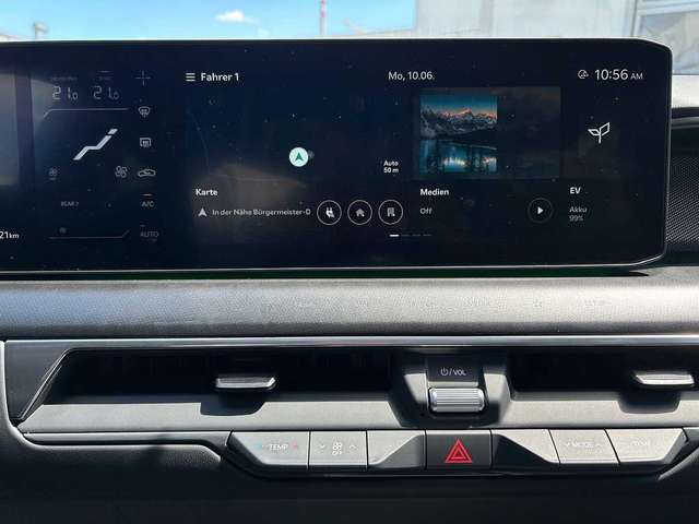 - Funktions-/KomfortausstattungFingerabdruck-ErkennungDigital Key 2.0 Elektronische Parkbremse mit Auto-Hold-FunktionSmart-Key und StartknopfAdaptive Dual-LED-ScheinwerferDämmerungssensorLED-RückleuchtenAußenspiegel elektrisch einstellbar und beheizbarAußenspiegel elektrisch anklappbarElektrische Fensterheber vorn und hinten mit Impulsfunktion an allen TürenV2L-AdapterUSB-C-Ladebuchsen an den Seiten der 3. Sitzreihe USB-Ladebuchsen an den Seiten der Vordersitze USB–Ladebuchse in der Tunnelkonsole hintenV2L: Laden von externen Geräten mit max. 3,6 kWInduktive Ladestation für SmartphonesSteckdose im GepäckraumKlimaautomatikElektrische Heckklappe, sensorgesteuertWärmepumpe zur Verbesserung der realen Reichweite bei niedriger AußentemperaturRegensensorIntegriertes 31,2-cm-Digitaldisplay (12,3 Zoll), gewölbtInnenspiegel selbstabblendend, digitalRundumsichtkamera Remote Smart Parking Assist 2.0 (RSPA): Parkassistent zum Ein- und Ausparken, Steuerung über Fernbedienung am Smart KeyHead-up-Display (HUD)Geschwindigkeitsregelanlage, adaptiv, inkl. Stopp & Go-Funktion Wippen am Lenkrad