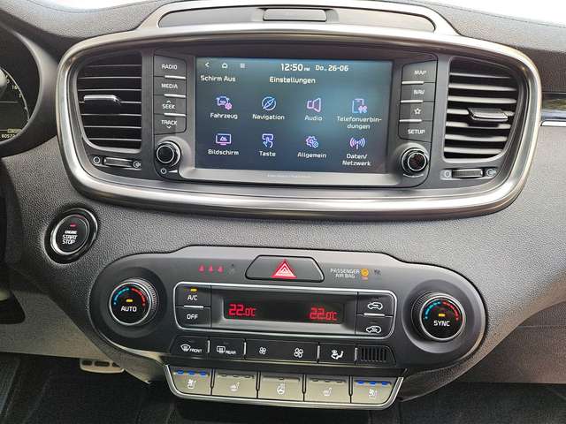 Abbiegelicht (Adaptives Kurvenlicht), Airbag Beifahrerseite abschaltbar, Airbag Fahrer-/Beifahrerseite, Aktiv Matrix Display, Aktive Kopfstützen vorn, Aktives Bremslicht (ESS), Ambiente-Beleuchtung, Audio-Navigationssystem KIA (8 Zoll), Audiobedienung am Lenkrad, Autom. Begleitfunktion der Beleuchtung, Außenspiegel elektr. anklappbar, Außenspiegel elektr. verstell- und heizbar, beide, Außenspiegel Wagenfarbe, Bi-LED-Scheinwerfer, Blinkleuchte in Außenspiegel integriert, Bordcomputer, Brillenfach in Dachhimmel / Dachkonsole integriert, Dachreling, Dachspoiler, Einschaltautomatik für Fahrlicht, Einstiegsleisten (Aluminium), Einstiegsleisten beleuchtet, Elektr. Bremskraftverteilung (EBD), Fahrassistenz-System: aktiver Spurhalteassistent (LKAS, Lane Keep Assist System), Fahrassistenz-System: Autonomer Notbrems-Assistent, Fahrassistenz-System: Bergabfahr-Assistent, Fahrassistenz-System: Berganfahr-Assistent, Fahrassistenz-System: Notbrems-Assistent, Fahrassistenz-System: Parklenkassistent (Smart Parking Assist System, SPAS), Fahrassistenz-System: Querverkehrs-Assistent (Rear Cross Traffic Alert, RCTA), Fahrassistenz-System: Spurhalteassistent Frontscheibe und Seitenscheiben wärmedämmend (Ausführung: Klimakomfort), Geschwindigkeits-Regelanlage (Tempomat) mit Abstandsregelung ACC, Getriebe Automatik - (8-Stufen), Head-up-Display (Frontsichtanzeige), Heckleuchten LED, Innenausstattung: Aluminium-Dekor, Lendenwirbelstütze Sitz vorn links, Lendenwirbelstütze Sitz vorn links, elektr. verstellbar, Lenkrad heizbar, Lenkrad mit Multifunktion, Lenksäule (Lenkrad) höhen-/längsverstellbar, Mittelarmlehne hinten, Modellpflege, Motor 2,2 Ltr. - 147 kW CRDi KAT, Nebelscheinwerfer LED, Panoramadach / Ausstelldach (Glas), Park-Assistent Intelligent Park Assist, Pedale Aluminium, Radstand 2780 mm, Reifendruck-Kontrollsystem, Reserverad in Fahrbereifung, Rücksitzlehne geteilt/klappbar, Schadstoffarm nach Abgasnorm Euro 6d-TEMP, Sitz vorn links elektr. verstellbar (10-fach), Sitz vorn links höhenverstellbar, Sitz vorn rechts elektr. verstellbar, Sitzausstattung: 5-Sitzer, Sitzbelüftung vorn, Sitzbezug / Polsterung: Leder schwarz, Sitzheizung vorn und hinten Sonnenschutzrollo an Türscheiben hinten, Sound-System Harman-Kardon.