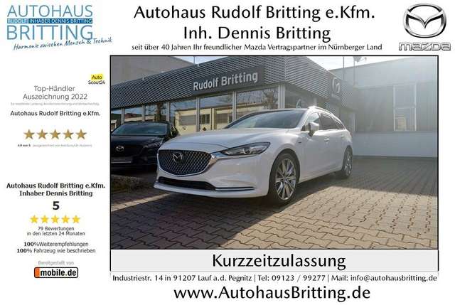 MAZDA 6 Modell 2023 2.5L SKYACTIV-Benzin 194PS 6-Gang-Automatikgetriebe Frontantrieb 20THANNIVERSARY mit Glasschiebedach in Rhodium White Metallic.