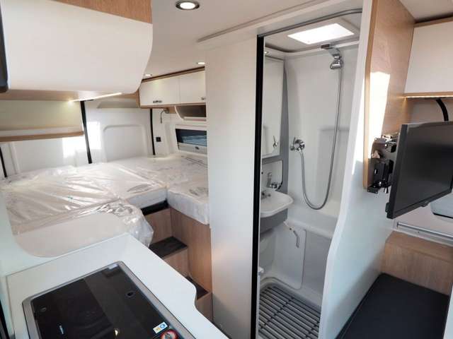 - Bei eingefahrener Toilette und eingeklapptes Waschbecken entsteht eine großräumige Dusche
