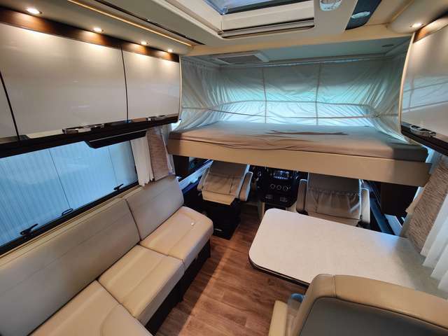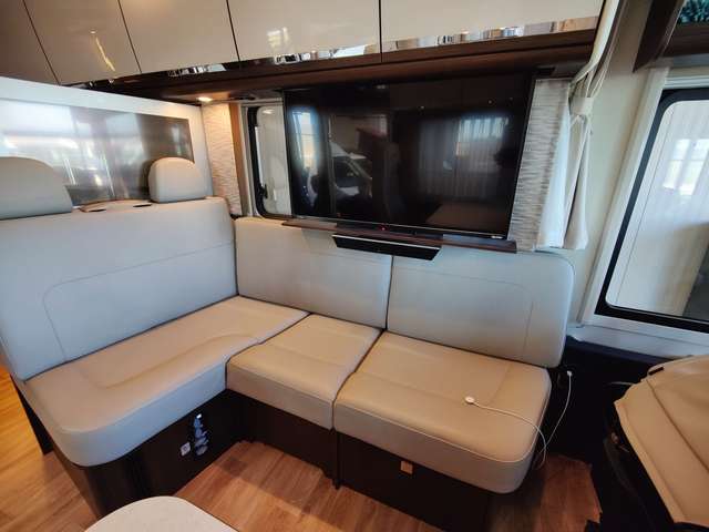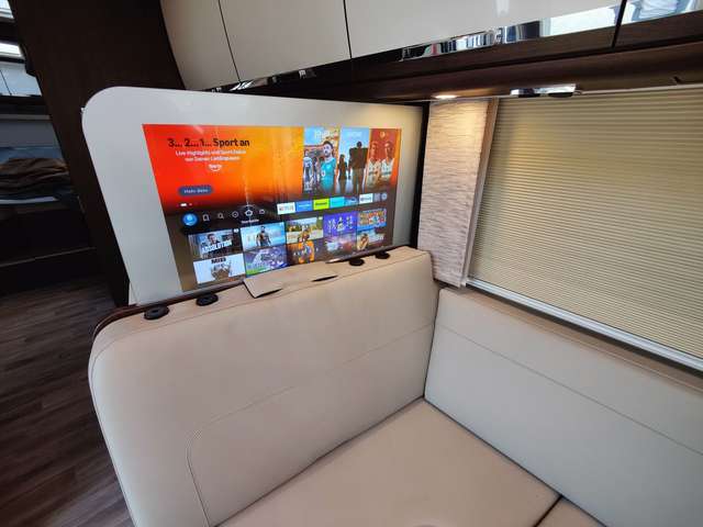 - TV Pakete mit LED Flachbildschirm: elektrisch absenkbarer 40" TV im Dinettenoberschrank (Fahrerseite) mit Gläsern und Soundbar, und 27" TV im Schlafraum, Satelliten-TV-Anlage Oyster V mit 85 cm Spiegel, vollautomatische Ausrichtung und Mehrteilnehmer-Ausstattung durch TWIN-LNB (Fahrzeuggesamthöhe + ca. 80 mm), LED Flachbildschirm mit Smart TV Funktion
