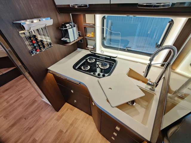 - Wohnwelt NOVEL: zum Wohnraum geöffnete Sitzbank, Küchenarbeitsplatte in Mineralwerkstoff mit Doppelspülbecken und großzügiger Arbeitsfläche, Vollauszüge im Küchenunterschrank, Nespressomaschine, Kapselhalter und 230 Volt Steckdose