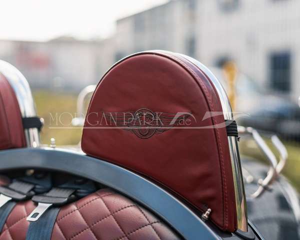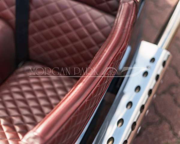 Im Innenraum überzeugt der Morgan mit edlem Yarwood Mulberry-Leder, einem belederten Armaturenbrett mit Morgan-Schriftzug, Sitzsteppung im Diamond-Stitch-Design sowie einem exklusiven Morgan Park Alcantara-Lenkrad. Eine Edelstahlplatte mit Kippschaltern ergänzt das klassische Cockpit auf stilvolle Weise. Auch an den Beifahrer wurde gedacht – eine Fußstütze sorgt hier für zusätzlichen Komfort.