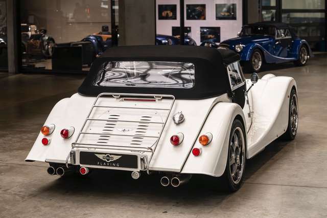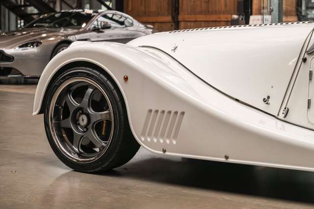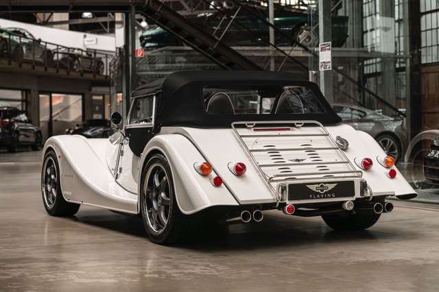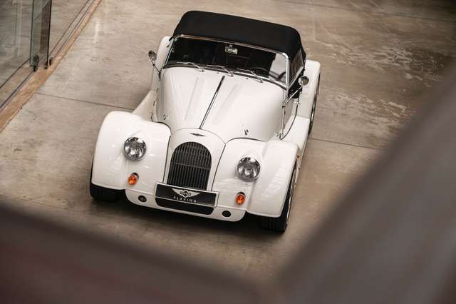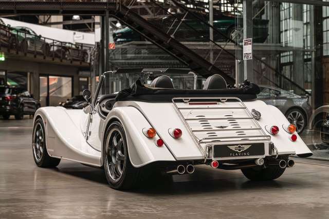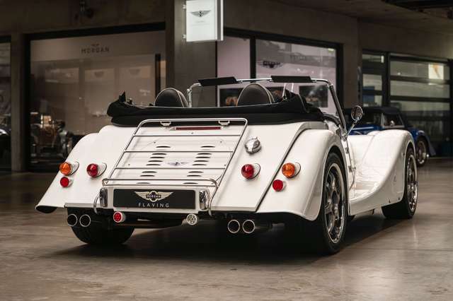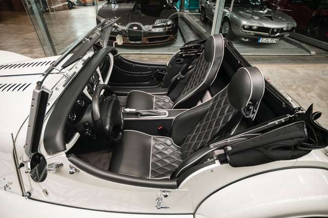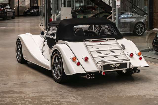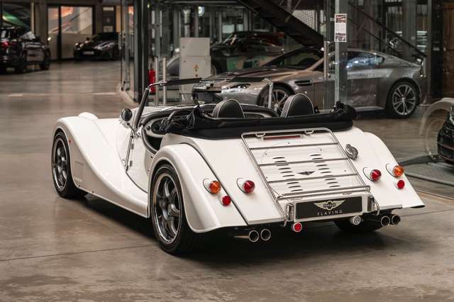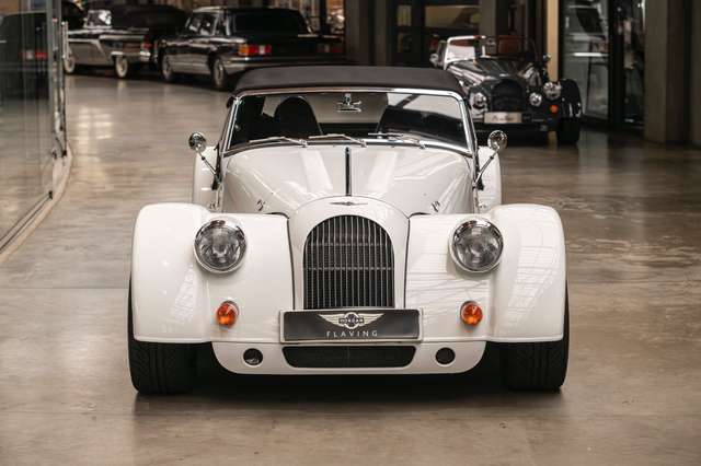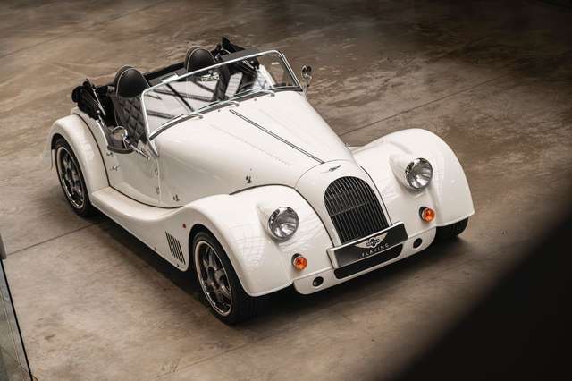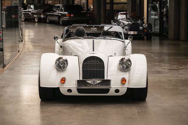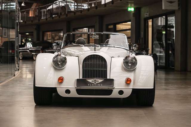 Wir bieten im Kundenauftrag diesen gepflegten Morgan Plus 8 mit dokumentierter Historie an. Der Plus 8 wird angetrieben durch den charismatischen 4.8l V8 von BMW. In diesem Exemplar wurde das ZF 6-Gang Automatikgetriebe als Option gewählt. Lackiert ist das Fahrzeug in Porsche Grandprix Weiß und steht auf 18" Leichtmetallrädern mit poliertem Kranz und Graphitgrau lackiertem Felgenstern. Für kernigen Sound sorgt die Sportabgasanlage von Aero Racing. Für Kontrast sorgt der schwarz lackierte Kühlergrill, sowie das schwarze Mohair Stoffverdeck.
