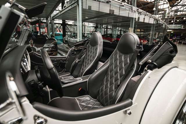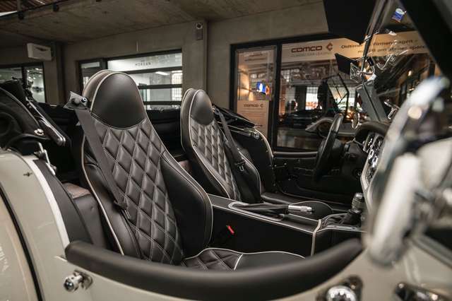 Das Interieur ist bezogen mit Muirhead Leder in anthrazit, welches durch Kontrastnähte und Kontrastkeder in Portland Grey ergänzt wird. Eine Besonderheit sind die gesteppten Sitze - ein Sonderwunsch, der damals in diesem Fahrzeug zum ersten Mal vom Morgan Werk umgesetzt wurde. Für gesteigerten Reisekomfort sorgen ein Tempomat, ein CD-Radio, eine Klimaanlage und praktische Türkartentaschen. Der Morgan Plus 8 wurde seinerzeit über uns bestellt und ausgeliefert.