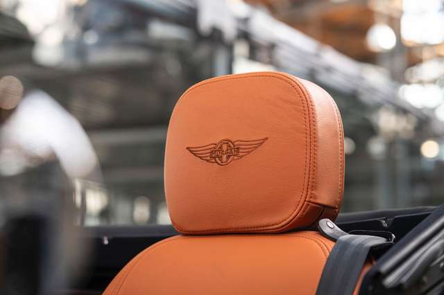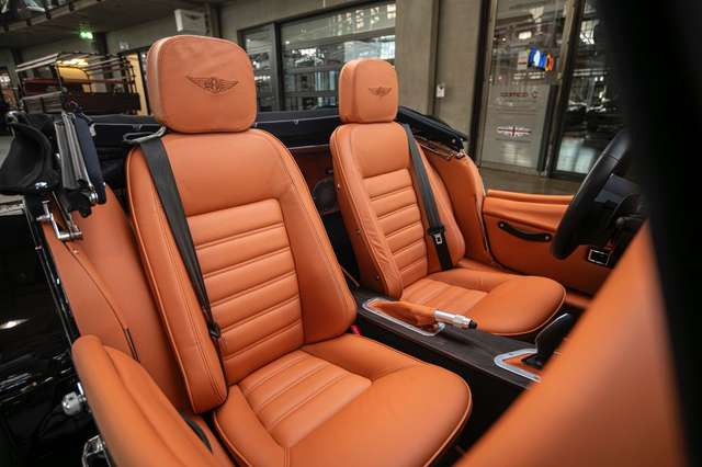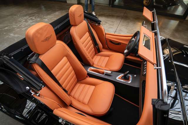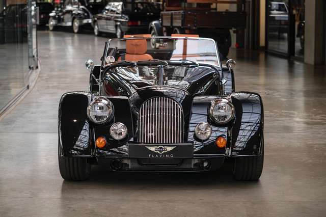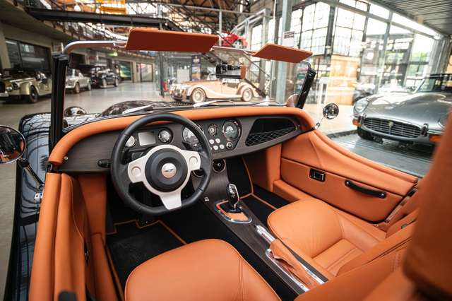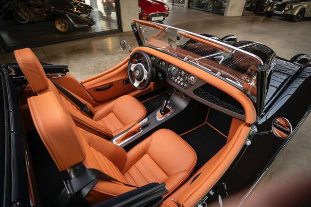 Das Interieur ist bezogen mit Pebble Grain Tan Leder, die Fußräume wurden verkleidet mit schwarzem Box Weave Teppich. Die Sitzeflächen weisen eine horizontale Steppung auf, die Kopfstützen sind bestickt mit der Morgan Schwinge in farblich zum Leder passendem Faden. Für gesteigerten Reisecomfort sorgt eine Kälteanlage, Sitzheizung für Fahrer und Passagier, eine Bluetooth Soundanlage und zwei USB Anschlüße. Die Mittelkonsole und das Armaturenbrett sind gefertigt aus Holz mit mattem Finish, was sowohl für eine authentische Haptik sorgt, als auch für ein edles Erscheinungsbild. Der Morgan Plus Six wurde ursprünglich neu über Morgan Flaving ausgeliefert.