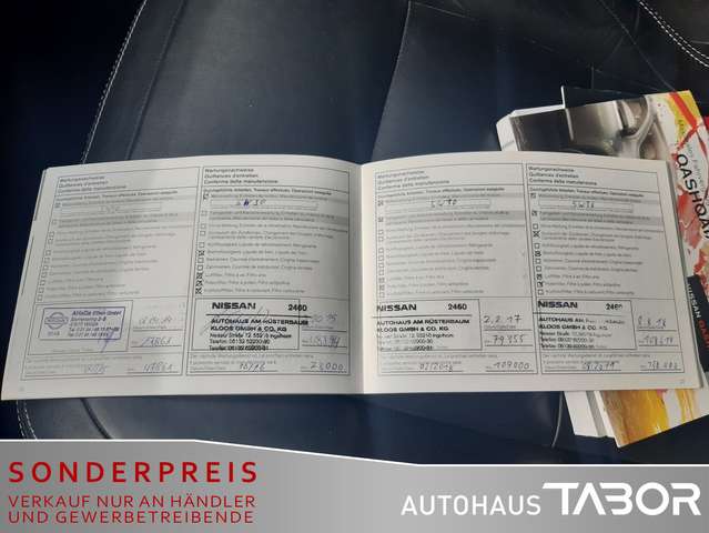 Metallic-Lackierung, Ausstattungs-Paket: Nissan Connect mit Around View Monitor (Audio-DVD-Navigationssystem Birdview / Nissan Connect mit Farbdisplay / Kamerasystem Around View / Rückfahrkamera), Komfort-Paket (CD-Wechsler (6-fach) / Einparkhilfe hinten), Xenon-Scheinwerfer (Scheinwerfer-Reinigungsanlage (SRA)), 3. Bremsleuchte, Außenspiegel Wagenfarbe, Außentemperaturanzeige, Elektr. Bremskraftverteilung (EBD), Heckscheibe heizbar, Karosserie: 5-türig, Kühlergrill Wagenfarbe, Lendenwirbelstütze Sitz vorn links, Lenksäule (Lenkrad) verstellbar, Mittelarmlehne hinten, Modellpflege, Motor 2,0 Ltr. - 104 kW 16V KAT, Pedale Aluminium, Radstand 2631 mm, Reifen-Reparaturset, Schadstoffarm nach Abgasnorm Euro 5, Sitz vorn links höhenverstellbar, Sonnenblenden mit Spiegel (beleuchtet), Sound-System BOSE, Bluetooth-Schnittstelle, Anti-Blockier-System (ABS), Antriebsart: Frontantrieb, Elektron. Stabilitäts-Programm (ESP), LM-Felgen 6,5x18, Wegfahrsperre (elektronisch), Getriebe Automatik stufenlos - Hypertronic CVT (M6), Klimaautomatik 2-Zonen, Airbag Beifahrerseite abschaltbar, Airbag Fahrer-/Beifahrerseite, Fensterheber elektrisch vorn + hinten, Isofix-Aufnahmen für Kindersitz, Kopf-Airbag-System, Mittelarmlehne vorn, Rücksitz geteilt/klappbar, Schließ-/Startsystem intelligent key, Seitenairbag, Sitzbezug / Polsterung: Leder, Sitzheizung vorn, Verglasung hinten abgedunkelt, Zentralverriegelung mit Fernbedienung, Bordcomputer, Dachreling (Edelstahl), Panorama-Glasdach, Wärmeschutzverglasung mit UV-Schutz, Fahrassistenz-System: Geschwindigkeits-Warnanlage akustisch (Speed-Limiter), Geschwindigkeits-Regelanlage (Tempomat), Audio-/Bordcomputerbedienung am Lenkrad, Lenkrad (Leder), Servolenkung elektronisch gesteuert, Außenspiegel elektr. anklappbar, Außenspiegel elektr. verstell- und heizbar, Automatische Fahrlichtschaltung, Nebelscheinwerfer, Scheibenwischer mit Regensensor
