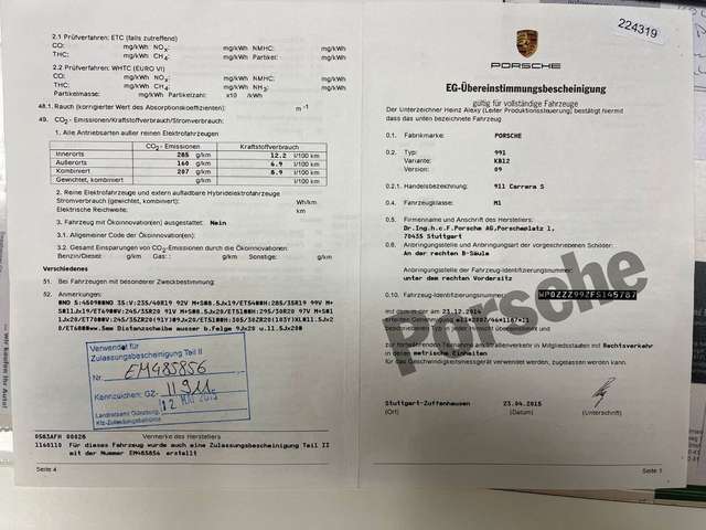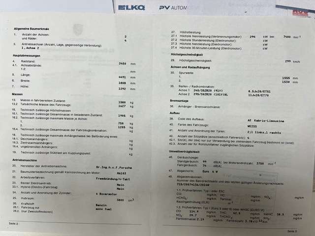 Fahrassistenz-System: Verkehrszeichenerkennung, Fußmatten, Fzg. ohne Modellbezeichnung, Home-Link (Garagentoröffner), Innenausstattung: Naturleder, Komfort-Paket, LM-Felgen vorn/hinten: 8,5x20 / 11x20 (911 Turbo Rad), Porsche Torque Vectoring Plus (PTV Plus), Raucher-Paket, Sportsitze vollelektrisch (14-Wege) inkl. Memory-Paket.