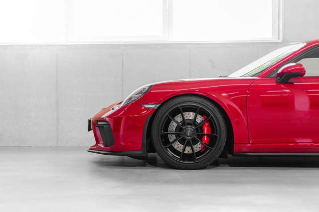Zu den auffälligsten Merkmalen dieses GT3 zählt sicherlich die Außenfarbe: Die Sonderfarbe Karminrot. Ganz im Sinne des puristischen Erscheinungsbildes erhielt dieses Modell Felgen, die im Farbton schwarz seidenmatt ab Werk ausgeführt wurden.