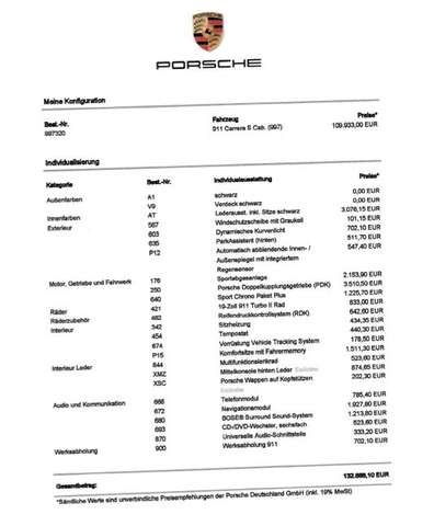 19-Zoll Turbo Rad; 3-Speichen-Multifunktionslenkrad; Automatisch abblendende Innen-/ Außenspiegel mit integriertem Regensensor; BOSE Surround Sound System inkl. CD-Ablage; CD-/DVD-Wechsler sechsfach; Dyn. Kurvenlicht; Fußmatten; Komfortsitze mit Fahrermemory; Lenkradheizung; Mittelkonsole hinten Leder; Navigationsmodul; ParkAssisten (hinten); Porsche Doppelkupplungsgetriebe (PDK); Porsche Wappen auf Kopfstützen; Reifendruckkontrollsystem; Sitzheizung; Sport Chrono Paket Plus; Sportabgasanlage; Telefonmodul; Tempostat; Universelle Audioschnittstelle; Vorrüstung Vehicle Tracking System; Windschutzscheibe mit Graukeil