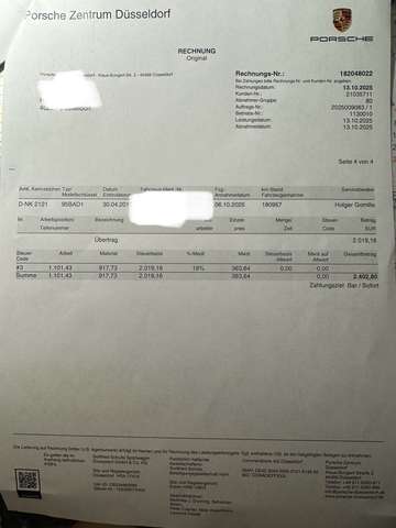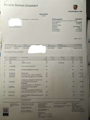 Ist frisch von Porsche abgeholt. Es fand am 13.10.2025 die große Wartung bei Porsche in Düsseldorf statt.