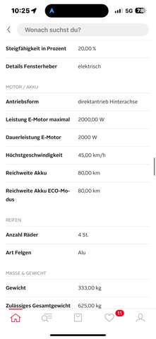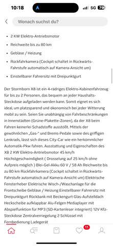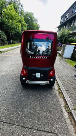Der Stormborn X8 ist ein 4-rädriges Elektro-Kabinenfahrzeug für bis zu 2 Personen, das bequem an jeder Haushalts-Steckdose aufgeladen werden kann. Somit eignet es sich ideal, um platzsparend und ökonomisch bei jeder Witterung mobil zu sein. Seien Sie unabhängig von Fahrbeschränkungen in Innenstädten (Grüne-Plakette-Zonen), da der X8 beim Fahren keinerlei Schadstoffe ausstößt. Mittels der gewöhnlichen „Gas-“ und Brems-Pedale sowie des griffigen Lenkrads, lässt sich dieses City-Car wie ein herkömmlicher Automatik-Pkw fahren. Ausstattung und Eigenschaften des X8 2 KW Elektro-Antriebsmotor 45 km/h Höchstgeschwindigkeit ( Drosselung auf 25 km/h ohne Aufpreis möglich ) Blei-Gel-Akku 60 V / 58 Ah Reichweite bis zu 80 km Rückfahrkamera (Cockpit schaltet in Rückwärts-Fahrstufe automatisch auf Kamera-Ansicht um) Elektrische Fensterheber Elektrische Wisch-/Waschanlage für die Frontscheibe Gebläse / Heizung Einstellbarer Fahrersitz mit Dreipunktgurt Rückbank mit Beckengurt Glas-Aufstelldach Heckscheibe aufklappbar Alu-Felgen Mediaplayer mit Abspielfunktion für MP3 (SD-Kartenleser integriert) 12V Kfz-Steckdose Zentralverriegelung 2 Schlüssel mit Fernbedienung Ladegerät