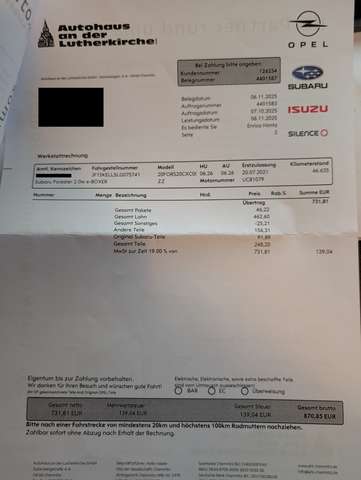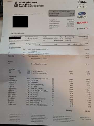 Ich verkaufe den Subaru aufgrund eines Todesfalls des Besitzers. Der Vorbesitzer war ein älterer Herr, der auch noch die letzte Durchsicht des Wagens (Rechnung bei den Bildern) veranlasst hat. Das Fahrzeug ist Scheckheft gepflegt und in technisch super Zustand. Ein paar Kratzer habe ich alle auf den Bildern markiert - soweit mir bekannt, kein Unfall nur Kratzer durch eine Hecke und rentnertypische Unachtsamkeiten. Im Auto wurde geraucht auch wenn es kaum danach riecht, dass kann man sicher mit Ozon bereinigen, aber ich will nichts verschweigen. Der Fahrersitz hat 2 kleine Brandflecke, vermutlich von einer Zigarette. Das Fahrzeug wurd innen und außen komplett gereinigt. Alufelgen für Sommer (Kofferraum) und Winterreifen (auf dem Auto)