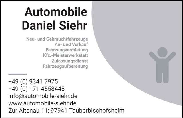 Wir freuen uns auf Ihren Anruf/Ihre Email. Solange das Fahrzeug hier noch inseriert ist, ist es in der Regel auch noch verfügbar. Gerne nehmen wir Ihren Anruf/Email entgegen, um einen Termin zur Besichtigung/Probefahrt auszumachen. Sollte bei dem hier angebotenen Fahrzeug ein von Ihnen gewünschtes Ausstattungsmerkmal fehlen, rüsten wir gerne nach: Freisprecheinrichtung, Parksensoren vorne/hinten, Anhängerkupplung - auch abnehmbar, Navigationssystem, Alufelgen, LED-Lampen, uvm. Finanzierung, auch ohne Anzahlung/Schlussrate, möglich! Gerne besorgen wir Ihnen gegen Aufpreis Überführungskennzeichen (Kurzzeit- oder Ausfuhrkennzeichen) und können für unsere ausländischen Kunden die Zollabwicklung durchführen. Auf Wunsch mit Garantie (gegen Aufpreis - ansonsten Gewährleistung) (Gewährleistung wird bei Gewerbetreibenden grundsätzlich ausgeschlossen!), weiterhin auf Wunsch HU/AU neu und mit neuer Inspektion von unserem Kfz-Meisterbetrieb, Inzahlungnahme möglich! Besuchen Sie uns im Internet: www.automobile-siehr.de - Dort finden Sie weitere interessante Angebote aus unserem aktuellen Fahrzeugbestand! Die im Internet gemachten Angaben sind unverbindliche Beschreibungen (oft als Datensatz über die Fahrgestellnummer – zur Verfügung gestellt von div. Plattformen) und stellen keine zugesicherte Eigenschaft im kaufrechtlichen Sinne dar! Der Verkäufer haftet nicht für Tipp- und Eingabefehler, Änderungen und Datenübermittlungsfehler! Als Rechtsgrundlage zählt der bei uns vor Ort getätigte Kaufvertrag. Alle Angaben ohne Gewähr, Zwischenverkauf vorbehalten.